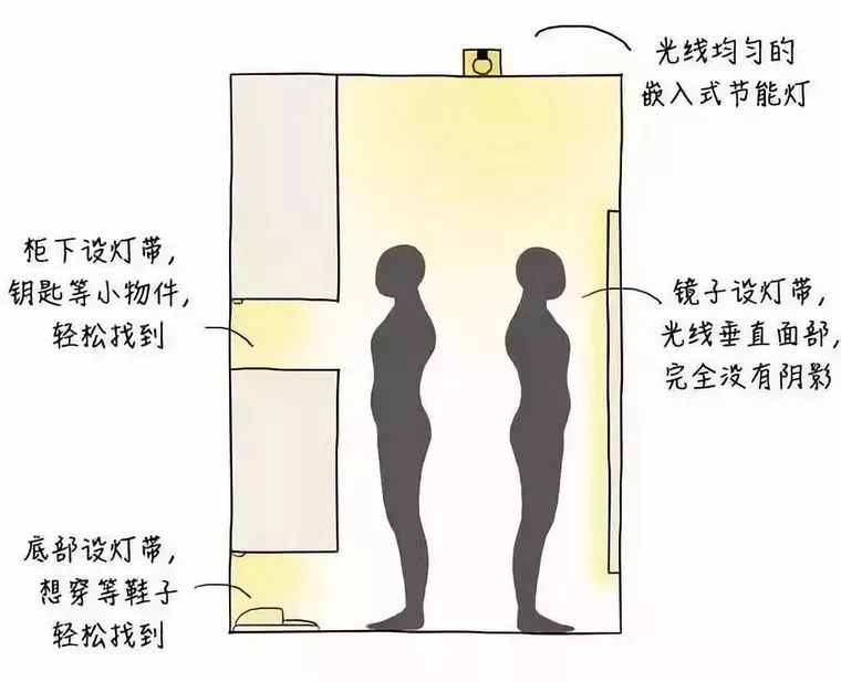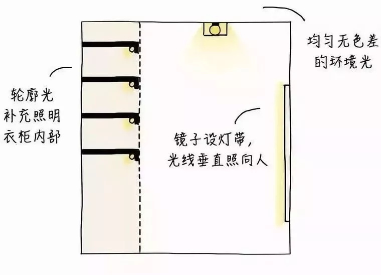 衣柜的局部照明,是為了方便使用者在打開衣柜時,能夠看清衣柜內(nèi)部的情況。衣帽間需要均勻、無色差的環(huán)境燈,鏡子兩側設置燈帶,衣柜和層架應有補充照明。最好選用發(fā)熱較少的LED產(chǎn)品▼
