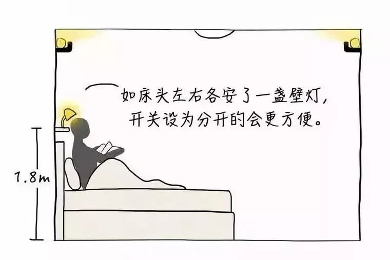 枕邊的局部照明是為了讓人在床上進行稅前活動和方便起夜設置的。可以在床頭距地約1.8m的兩段墻壁,安裝不占空間的壁燈。或者設置床頭柜臺燈或者落地燈也可以▼