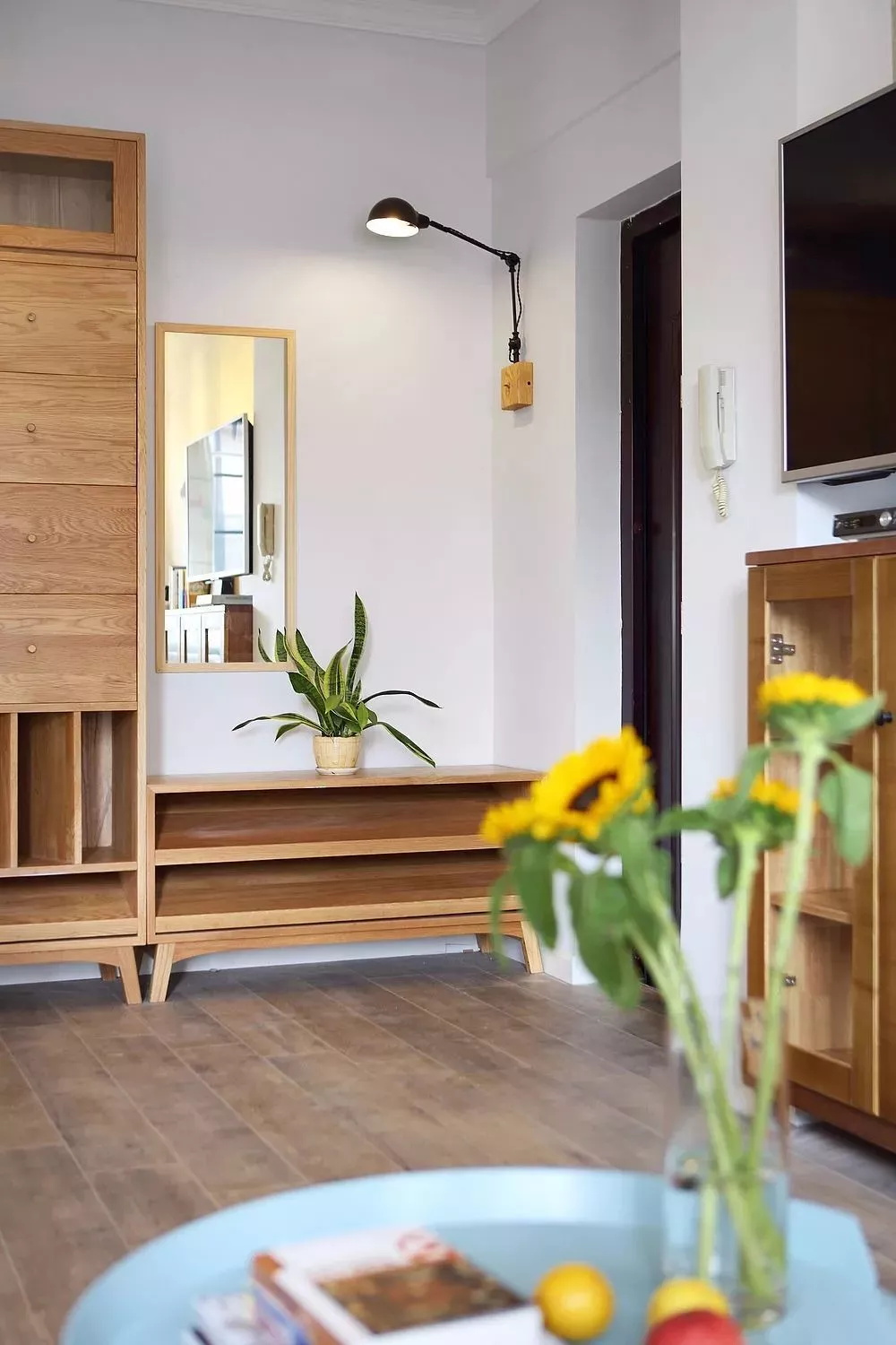 正對(duì)大門的柜子,可以收納一些零碎的東西,如果再放上綠植、掛畫(huà)搭配就非常有格調(diào)。