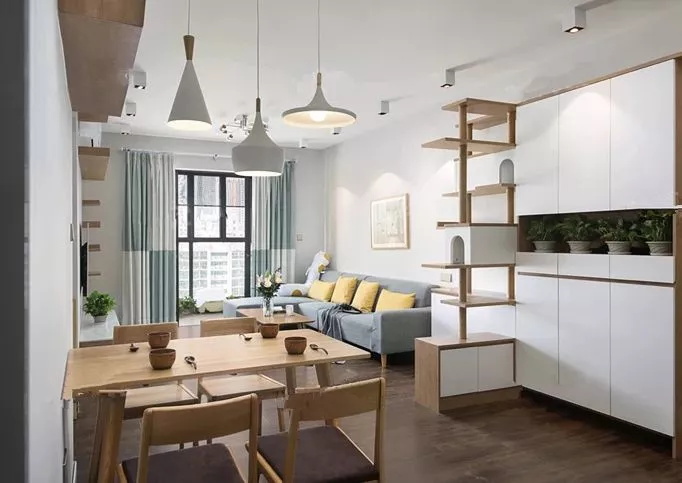 沒(méi)有空間設(shè)置玄關(guān)柜,怎么辦?直接順著墻壁在餐廳這里做一個(gè)柜子隔斷,使大門處形成一個(gè)過(guò)道式的玄關(guān),另一側(cè)則是餐廳。這樣一來(lái),不僅玄關(guān)有了,柜子的收納能力也是杠杠的,而且還順帶遮擋了餐廳空間,保持了私密性。