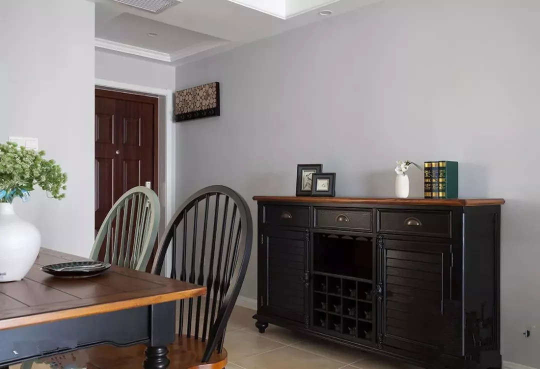 由于餐桌也在門口,所以把玄關(guān)柜與餐邊柜相結(jié)合。上下柜的設(shè)計(jì),不僅增大收納空間,而且還能有效區(qū)分柜子的功能。