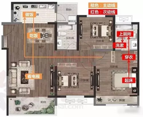 戶型動線是指人在戶內(nèi)活動的路線,好的動線能夠提升戶型利用率,進而提高人們的居住品質(zhì)。戶內(nèi)動線主要有三種,分別是居住動線、家務動線、來客動線。良好的動線是指從入戶門進客廳、臥室、廚房的三條線不會交叉。