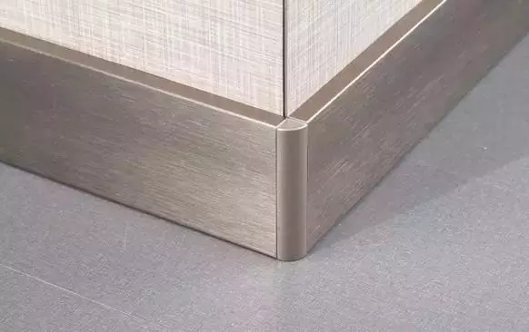 有不銹鋼和鋁合金兩種。早期以金屬光澤居多,多用于辦公室或工業(yè)風(fēng);現(xiàn)在很多鋁合金踢腳線有了更多的變化,比如木紋、拉絲等,視覺效果也柔和許多,更適合一般家庭使用。因其材質(zhì),轉(zhuǎn)角的處理也會(huì)更好。造價(jià)相比石材,也較為便宜。