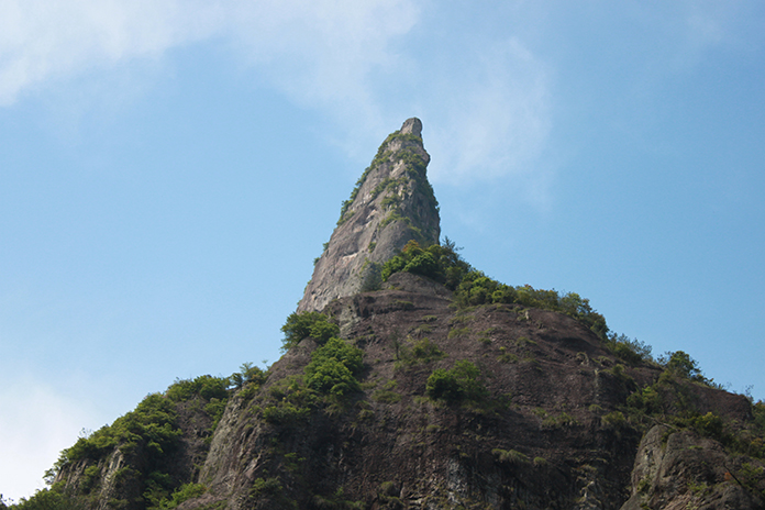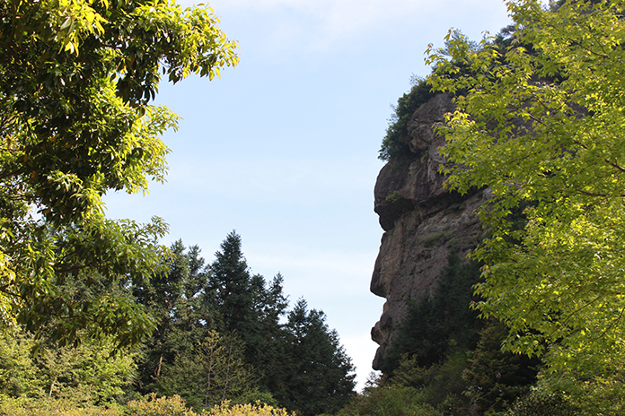我們經(jīng)過“問仙橋”,走著那清涼的石子小路,來到“神筆畫天”面前,看呀,那座山的山坳里露出了一個毛筆頭,筆尖對著天空,漸漸飄來的白云,好像是它那杰出的作品。真不知是哪位神仙把那么珍貴的寶物丟在了神仙居這廣闊的土地上。