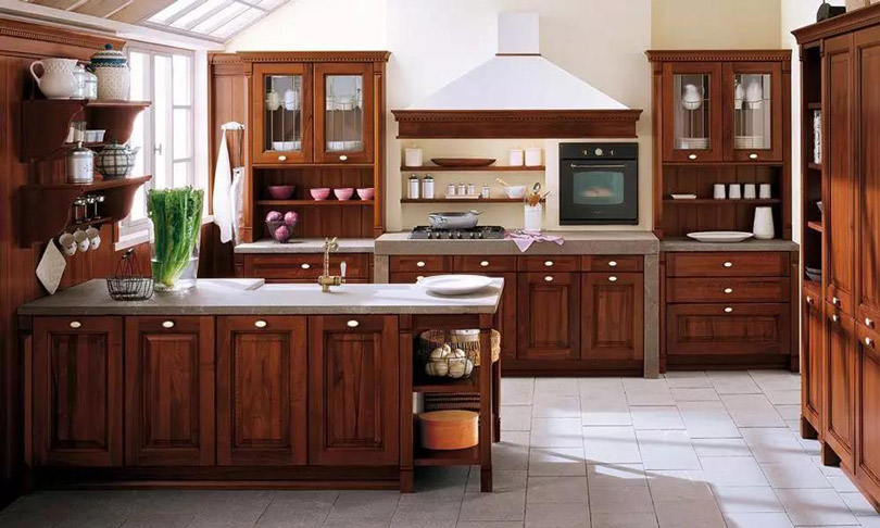 使用實(shí)木制作櫥柜門板,風(fēng)格多為古典型,美式、中式家居風(fēng)格中比較常見,以櫻桃木色、胡桃木色、橡木色為主。