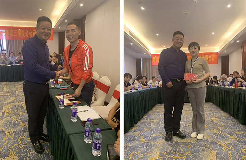 會議第一階段,匯總上季度業(yè)績并對各分公司PK結果進行公布,董事長祝旭慷對獲勝分公司進行頒獎。
