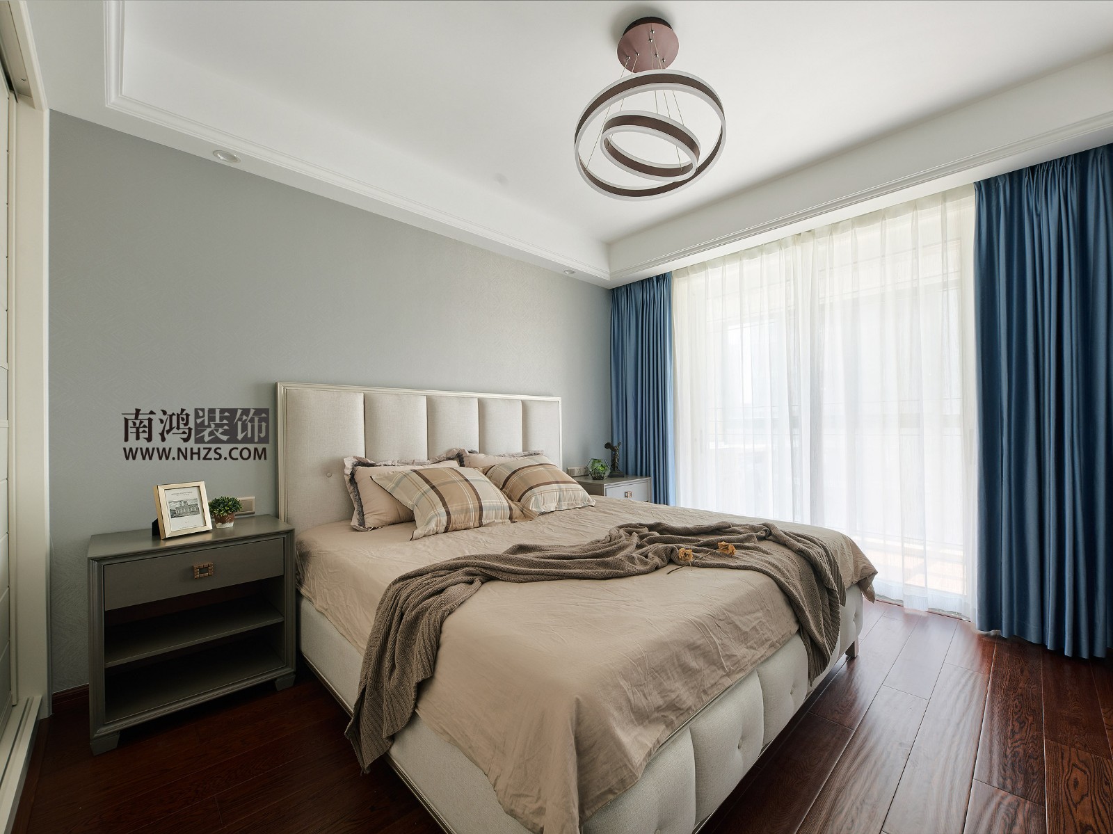 次臥是一個低調(diào)沉穩(wěn)的灰色空間,無論是頂部的藝術(shù)吊燈,還是深灰色的床頭柜,造型都非常簡約。落地窗為室內(nèi)導(dǎo)入通透光線,顯得清爽而透亮。