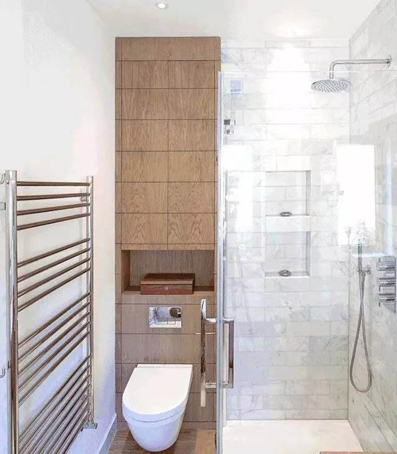 大部分家庭會安裝壁掛式馬桶,因為這樣會讓衛生間更加干凈,而壁掛式馬桶需要將其水箱隱藏起來,把馬桶后面的整堵墻都加厚,或者只加厚水箱以下的墻面,此時這部分位置就可以設計出壁龕。