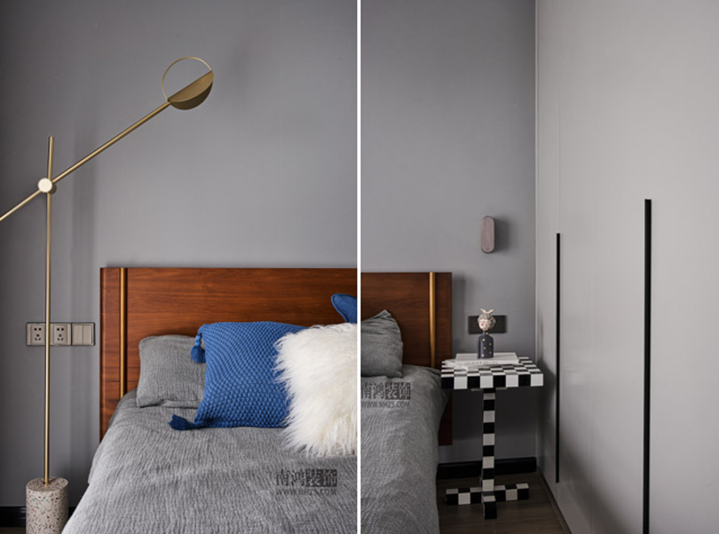 次臥以不同階度的灰色打造,色調統一的同時又巧妙劃出了層次,一角黑白塊樣式的小幾替代了床頭柜,是個小亮點。