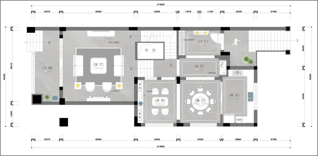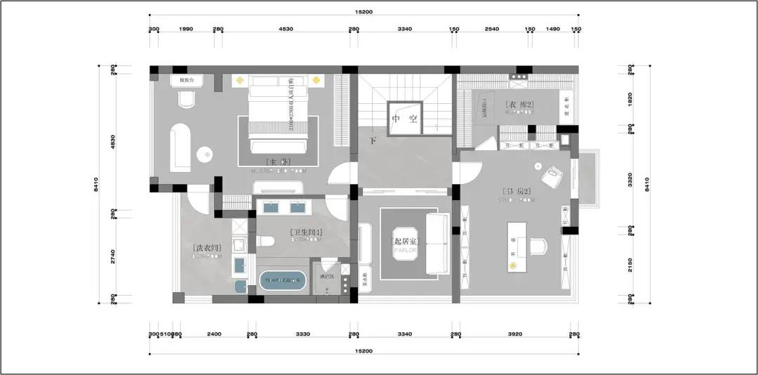 本案戶型為104方,三房兩衛的方正結構,無暗衛暗室,業主需求新穎的設計與當下比較流行的智能家居。